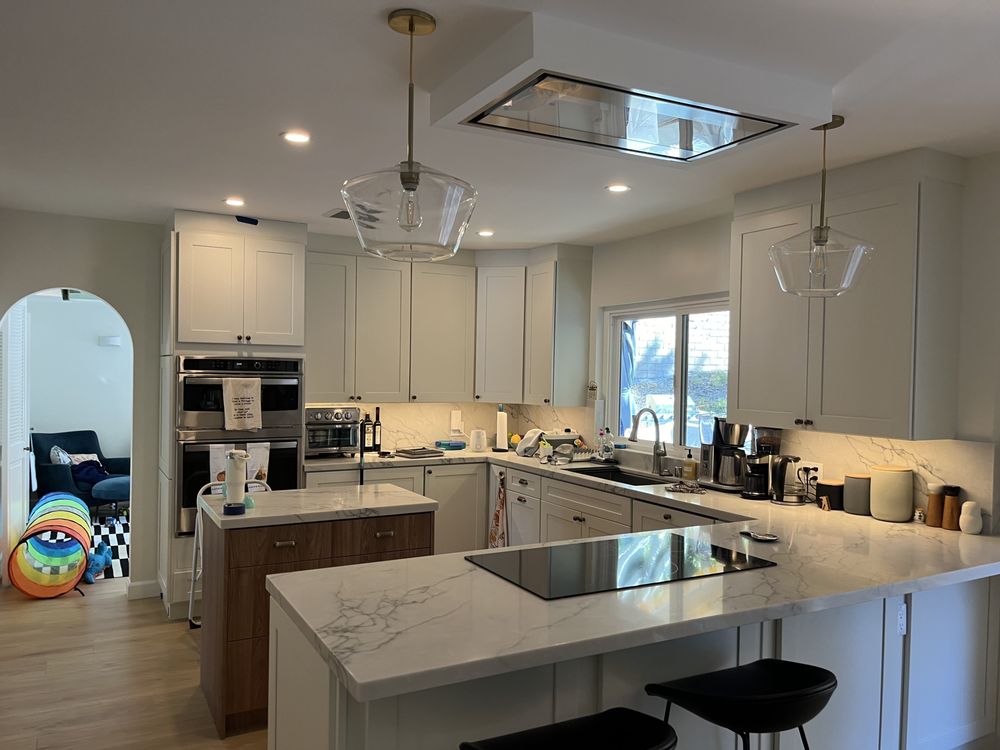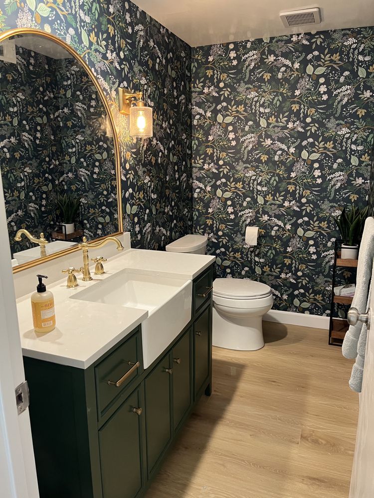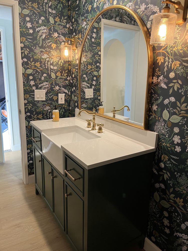 Full kitchen, dining, and bathroom remodel. White shaker cabinets, marble-veined quartz, walnut island, brass fixtures, and a botanical wallpaper powder room that ties it all together.